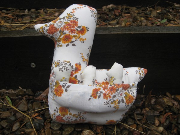 All the birds are made out of recycled fabrics. The hanging doves were uber retro, made out of op-shopped fabric I had been hoarding since I was a teenager! The chickens had more of a vintage feel, some featured doilies as wings, others had pocket wings with lace trim and others just had big, funky, oversized pocket wings.